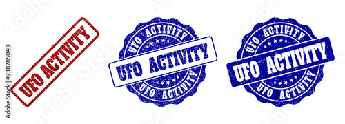 UFO ACTIVITY grunge stamp seals in red and blue colors. Vector UFO ACTIVITY signs with grunge texture. Graphic elements are rounded rectangles, rosettes, circles and text titles.