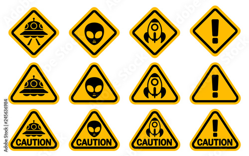 UFOに注意 宇宙人に注意 ロケットに注意 警告サイン 「CAUTION」のセット