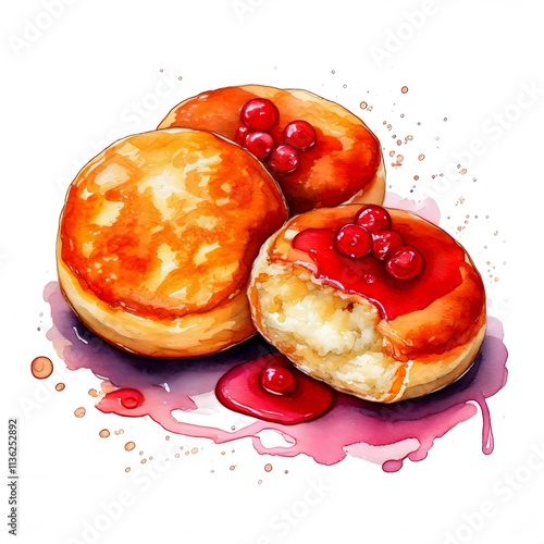 Ukrainian Syrnyky topped with berry jam on white background, watercolor illustration for Cookbooks or food blogs