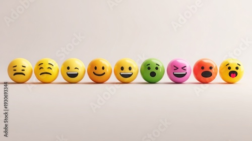 ultra detailed 3D render of symmetrical row of emoji faces showing different emotions on soft white background, clean shadows, minimal social media