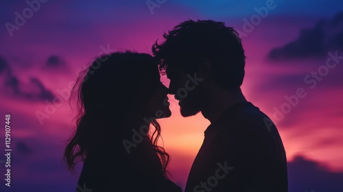 photorealistic, high, resolution, smooth, closeup, silhouette, couple, sharing, kiss, against, fiery, sunset, dark, red, gold, hue, clear, high-coloured, sky, gentle, blending, colours, figure, defined, by, light, shadow, creating, romantic, passionate, scene
