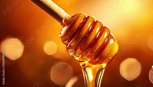 Ultra macro shot of golden honey dripping from a wooden honey dipper, glistening in warm light. Perfect for showcasing the texture and richness of honey in a natural, appetizing setting.
