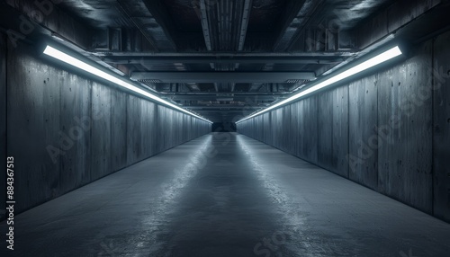 Ultra sharp photo capturing dark underground tunnel corridor with stark white LED lights against