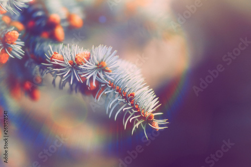 Ultra violet purple natural textured background in Color of the Year 2018. Blue spruce Christmas tree branches. duotoned, abstract toned photo