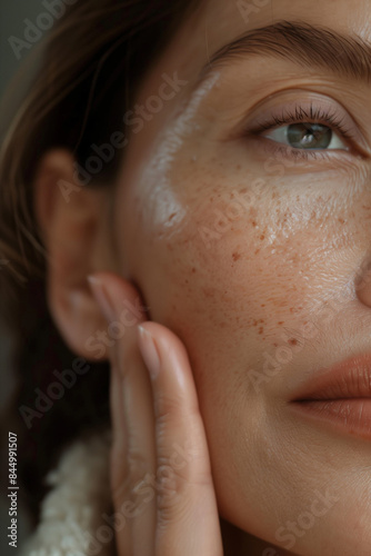 Ultra-Detailed Close-Up Photo of a Middle-Aged Woman, Touching Her Face with Healthy Skin