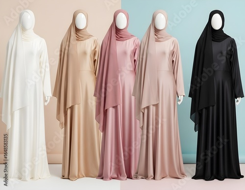 Ultra-realistic mockup of long satin dress and hijab, premium fabric texture, no logo/text/human, front & back view, seamless neutral background, soft studio lighting, high-res commercial style.