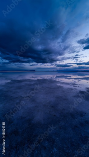 Ultra-wide landscape of a salt lake under stormy indigo sky