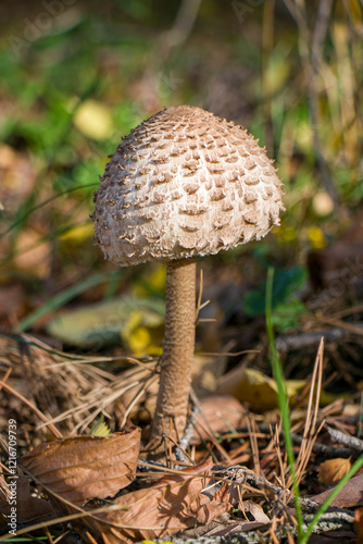 Umbrella mushroom (Macrolepiota procera) in its natural habitat. Umbrella mushroom Macrolepiota procera in an autumn forest.