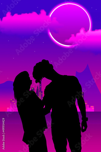 couple, love, silhouette, evening, moon, people, woman, vector, illustration, romance, heaven, romantic, kiss, man, valentine, star, ticker, family, wedding, flower, happiness, art, blue, sunset