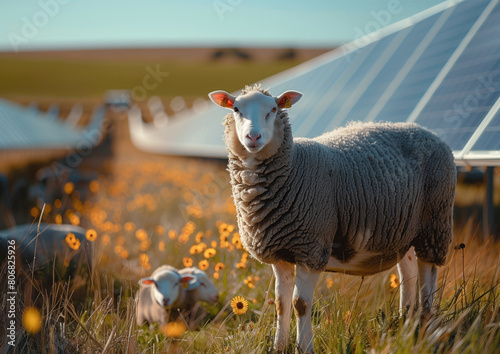 Un campo de flores amarillas junto a hileras de paneles solares, granja de ovejas, pastoreo y tecnología de punta conviviendo, protección del medio ambiente. Economía circular, aprovechando recursos