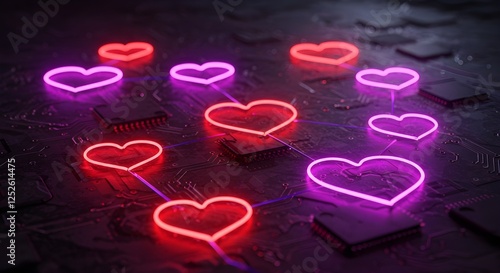 Un concepto futurista de una red digital compuesta de corazones de neón interconectados, pulsando con energía, frente a un fondo oscuro de alta tecnología.