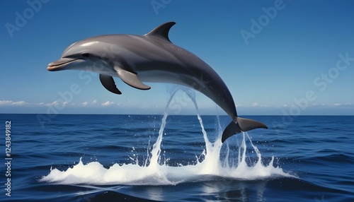 Un gran delfín saltando fuera del agua con agua salpicando a su alrededor contra un fondo de cielo azul profundo