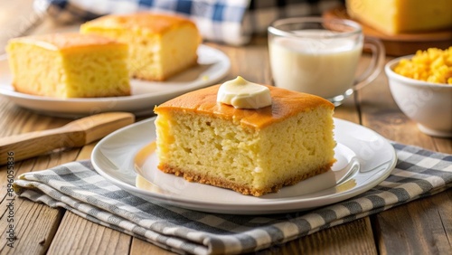 Un plato de pan de maíz de la cocina americana, servido en un plato blanco sobre una mesa de madera. El pan de maíz está acompañado de una copa de leche.