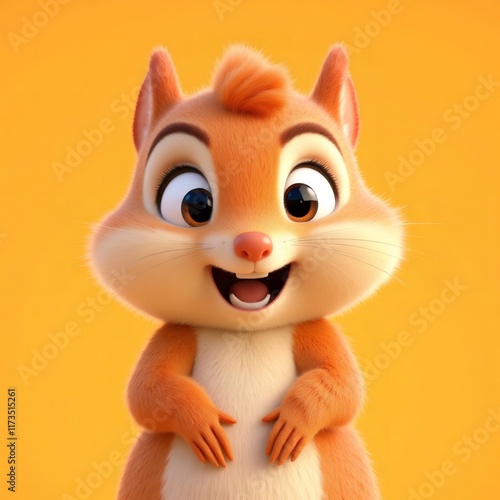Una ardilla animada de pelaje naranja y blanco se destaca sobre un fondo amarillo brillante, capturando la atención de niños y adultos por igual