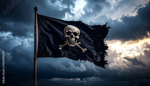 Una dramática fotografía de una bandera pirata destrozada ondeando desafiante contra un cielo tormentoso de fondo. La imagen simboliza el peligro, la rebeldía y el espíritu rebelde de la vida pirata.