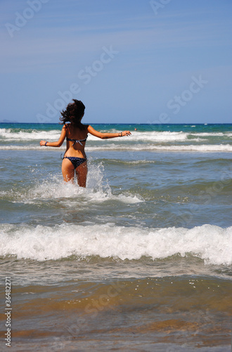 una ragazza corre nel mare