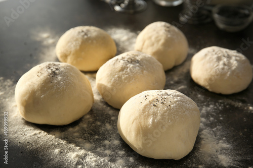 Unbaked buns with poppy seeds on table