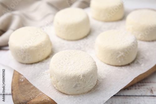 Uncooked cottage cheese pancakes on white wooden table, closeup