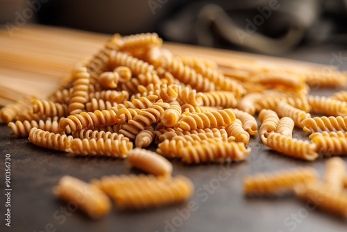Uncooked whole grain pasta. Fusilli pasta on black kitchen table.