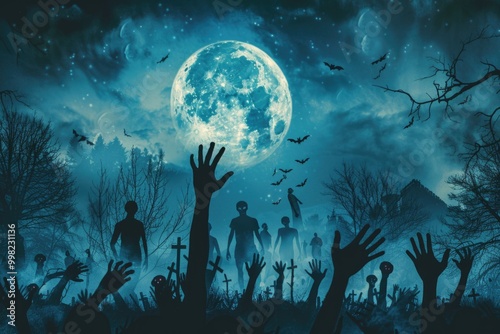 Undead hands reaching up towards the full moon, dark and mysterious scene