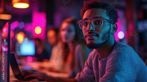 Under colorful lighting, a focused young man works intently on his laptop while others enjoy the lively ambiance at a trendy cafe. The energy is palpable as night unfolds