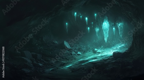 Underground cave with luminescent mineral formations, glowing softly and illuminating the space.