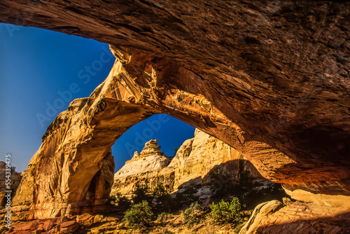 arch, sandstone, underneath, blue skies, red, rock formation, horizontal, outdoors, day, colourful, closeup, sunny, vibrant, bright, desert, tour tourism, us, tourist destination, arid climate, copy space, clear sky, nature, scenic, attraction, destination, travel, utah, landscape, national park, color image, tourist attraction, travel destination, national landmark, no people, point of view