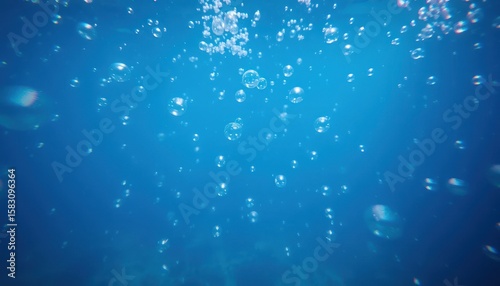 Underwater bubbles floating in a blue ocean background with sunlight reflections