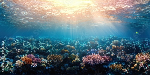 Underwater Coral Reef with Sunbeams and Fish