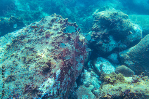 Underwater photo near the coast of flora and fauna on rocky seabed