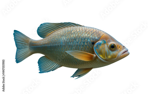 Underwater photo of tilapia fish swimming in a clear freshwater lake.