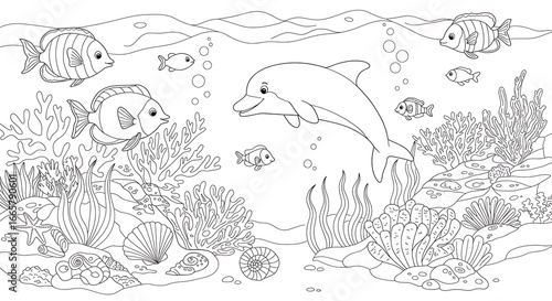 dolphin, fish, coral, reef, ocean, sea, underwater, marin, aquatic, colouring, page, illustration, drawing, black, white, animal, nature, wildlife, seashell, starfish, seaweed, algae, invertebrate, vertebrate, mammal, cartoon, cute, playful, happy, fun, children, children, book, activity, design, graphic, art, image, picture, visual, element, template, background, pattern, summer, water, tropical