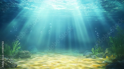 Underwater Scene with Sunlight and Marine Plants and Rocks