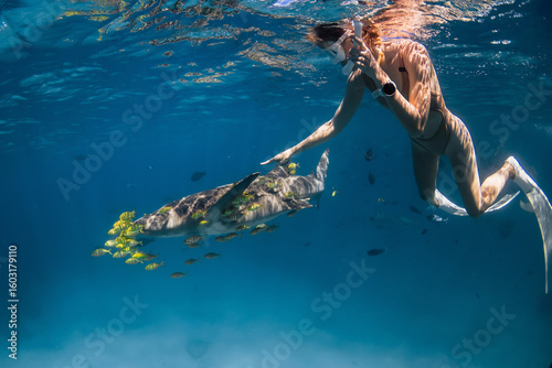 Underwater shot of woman snorkeling and interacting with a nurse shark, surrounded by tropical fish in salty water