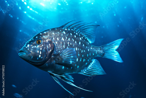 Underwater View of a Spotted Fish in the Ocean with Sunlight Filtering Through Water