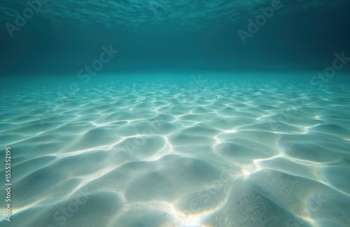Underwater view of sandy ocean floor. Sunlight creates ripple patterns on sand. Transparent water, deep blue shades give calmness. Minimalist nature eco photo for travel agencies.