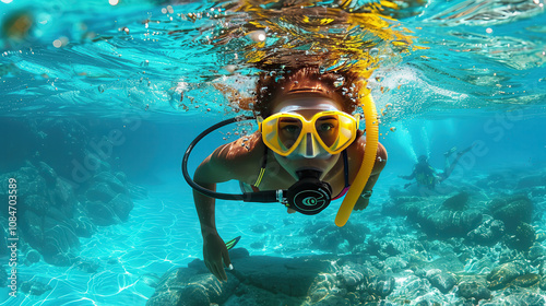 Underwater view scuba diver sunlight breaking through water, diver surrounded deep blue ocean