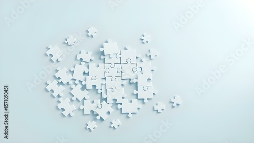 "Unfinished Puzzle Pieces Background: White Jigsaw Scattered and Partially Connected on a Light Blue Surface, Symbolizing Problem-Solving, Teamwork, and Incomplete Tasks."