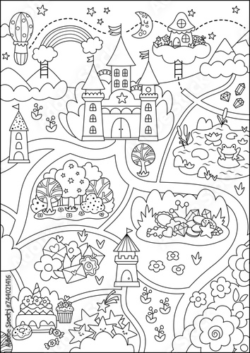 unicorn, country, map, illustration, black, white, contour, colouring, page, book, line, outline, village, fantasy, magic, fairy tale, earth, puzzle, road, path, scene, nature, rainbow, moon, sky, cloud, ladder, meadow, flower, star, forest, mountain, castle, tower, bungalow, garden, lake, treasure, landscape, vertical, layout, background, party, vector, children, baby, children, cute, cartoon