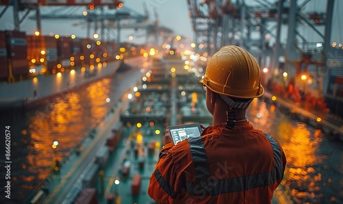 Uniform-clad engineer inspects container details on a tablet, amidst the shipyard's bustling cargo yard and operational cranes, facilitating import and export logistics.