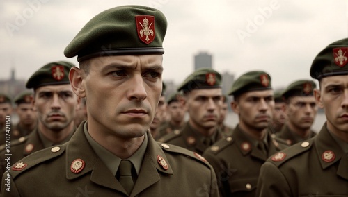 soldier, military, uniform, formation, olive, green, serious, dedicated, foreground, stoic, parade, background, focused, courage, training, oneness, teamwork, bravery, readiness, order, strength, patriotism, commitment, duty, city, building, outdoors, male, young, leadership, determination, group, preparedness, strategy, defense, command, service, country, loyalty, resilience, setting, scene, expression, pride