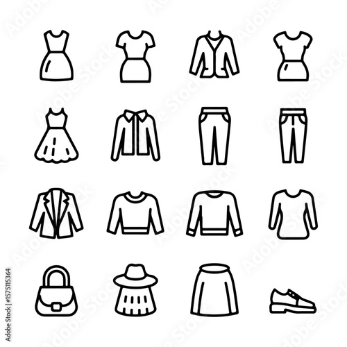 woman, clothing, fashion, apparel, icon, icon, design, line, vector, style, outfit, wear, dress, shirt, top, pant, skirt, jean, jacket, coat, foulard, hoodie, blazer, model, female, girl, beauty, trendy, modern, casual attire, formal, clothes rack, shopping, store, illustration, template, symbol, set, graphic, minimal, simple, outline, editable, flat, branding, label, wearable