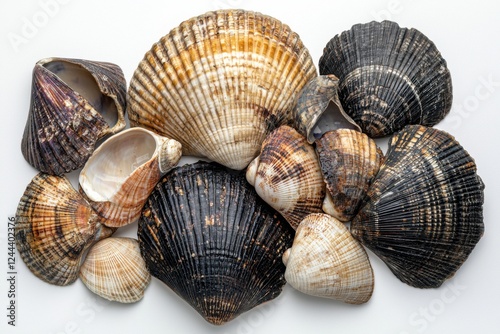Unique collection of various seashells arranged chaotically on a white surface