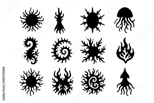 Unique silhouette designs of abstract tribal sea creatures and flames