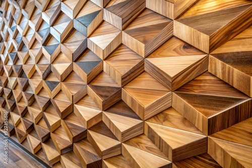 Unique wooden wall design featuring intricate geometric patterns, natural wood grain, and precision-cut joints, creating a warm and modern interior architectural accent.