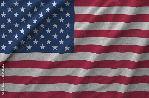 United States of America flag depicted on folded wavy fabric of old cloth close up