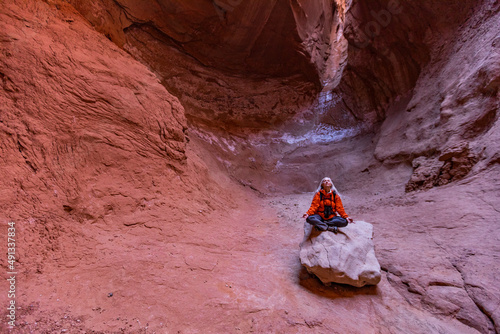 United States, Utah, Escalante, Senior female hiker sitting on rock in canyon