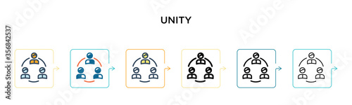 Unity vector icon in 6 different modern styles. Black, two colored unity icons designed in filled, outline, line and stroke style. Vector illustration can be used for web, mobile, ui