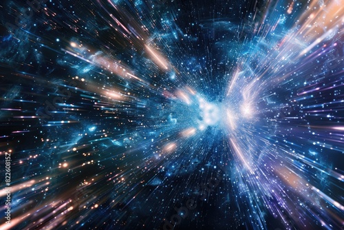 Universe Light. Space Explorer Wallpaper with Warp Speed Travel in Outer Galaxy