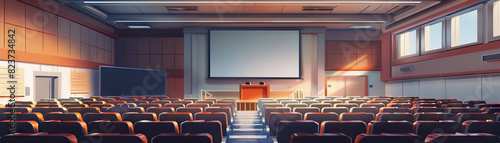 University Lecture Hall: Featuring rows of seats, a podium, projector screen, and students listening to a lecture